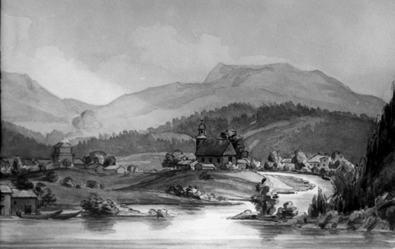 Målning med bebyggelse, samt skogsbygdsmotiv.