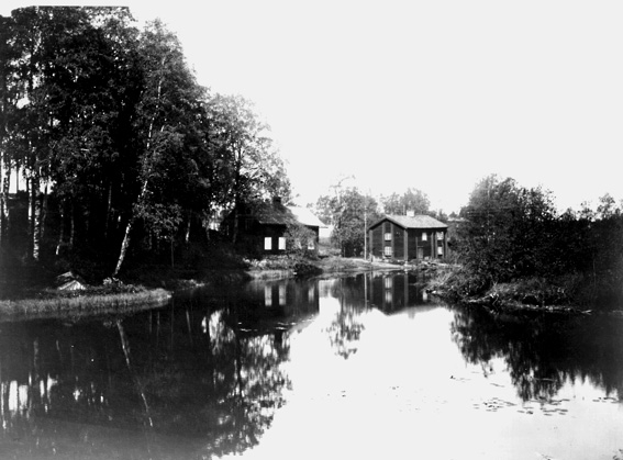 Oidentifierad bebyggelse vid vattendrag.