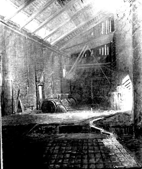 Tecknad interiör från, förmodligen, en hytta gjord av Olof W. Nilsson 1919.