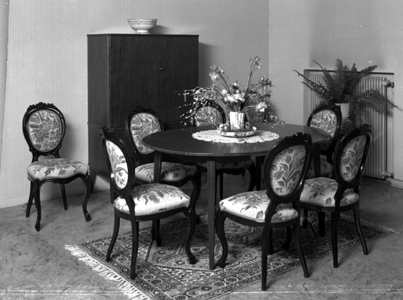 Rokokoinspirerad matsalsmöbel samt ett skåp vid väggen.