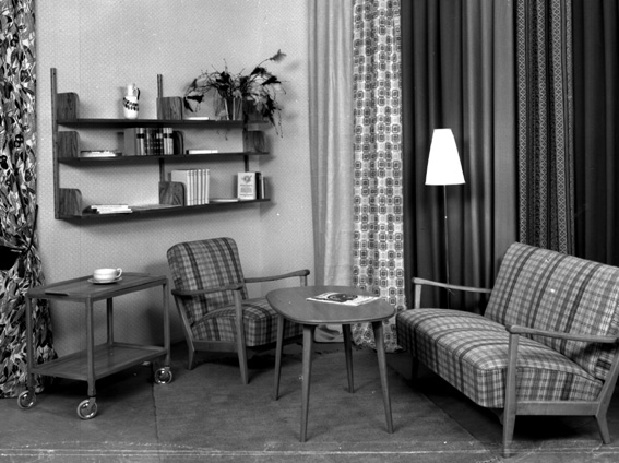 Soffgrupp, bord, golvlampa, serveringsvagn samt en bokhylla på väggen.