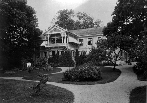 Större trävilla i två plan med skiffertak, glasveranda samt balkong med snickarglädje i parkliknande trädgård.
