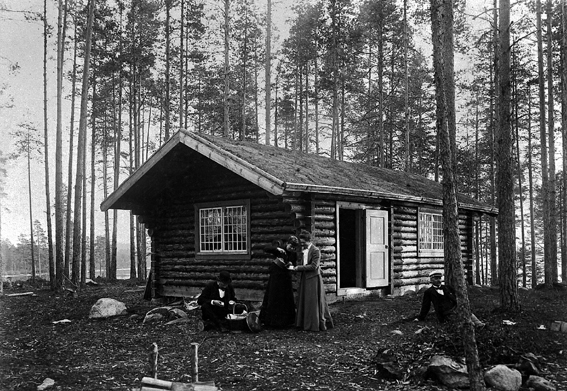 Män och kvinnor vid timrad stuga i skogsglänta.