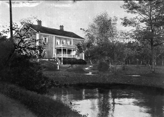 Herrgårdsliknande byggnad med veranda och balkong. Damm i förgrunden.