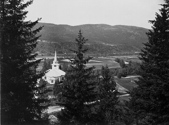 Vy över skogsbygd med kyrka, samt höga granar i förgrunden.
