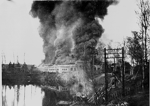 Brand i industribyggnad vid vattendrag.