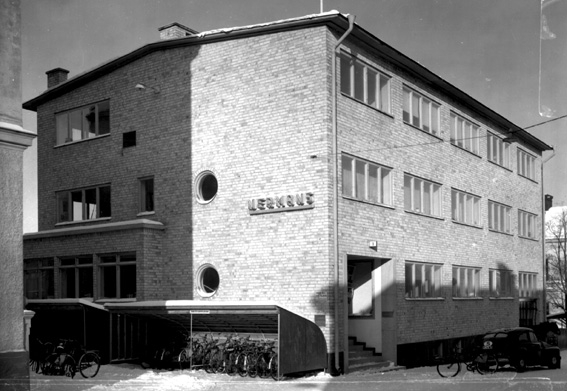 Större trevåningshus i sten med källare och firmanamnet "Nermans" på gaveln, samt cyklar i cykelställ. Bil parkerad vid entrén.