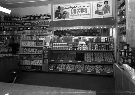 Butikslokal med hyllor fyllda med diverse varor samt reklam för Luxus kaffe på väggen.