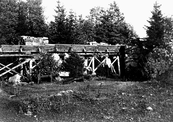 Hättälven 1918. Man vid timmerrännan byggd 1908, samt ruin av hammarsmedjan i bakgrunden.