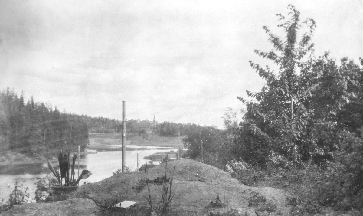 Titel: Vy från Klippan i Hjulsbro över Stångån mot Landeryds kyrka i söder.