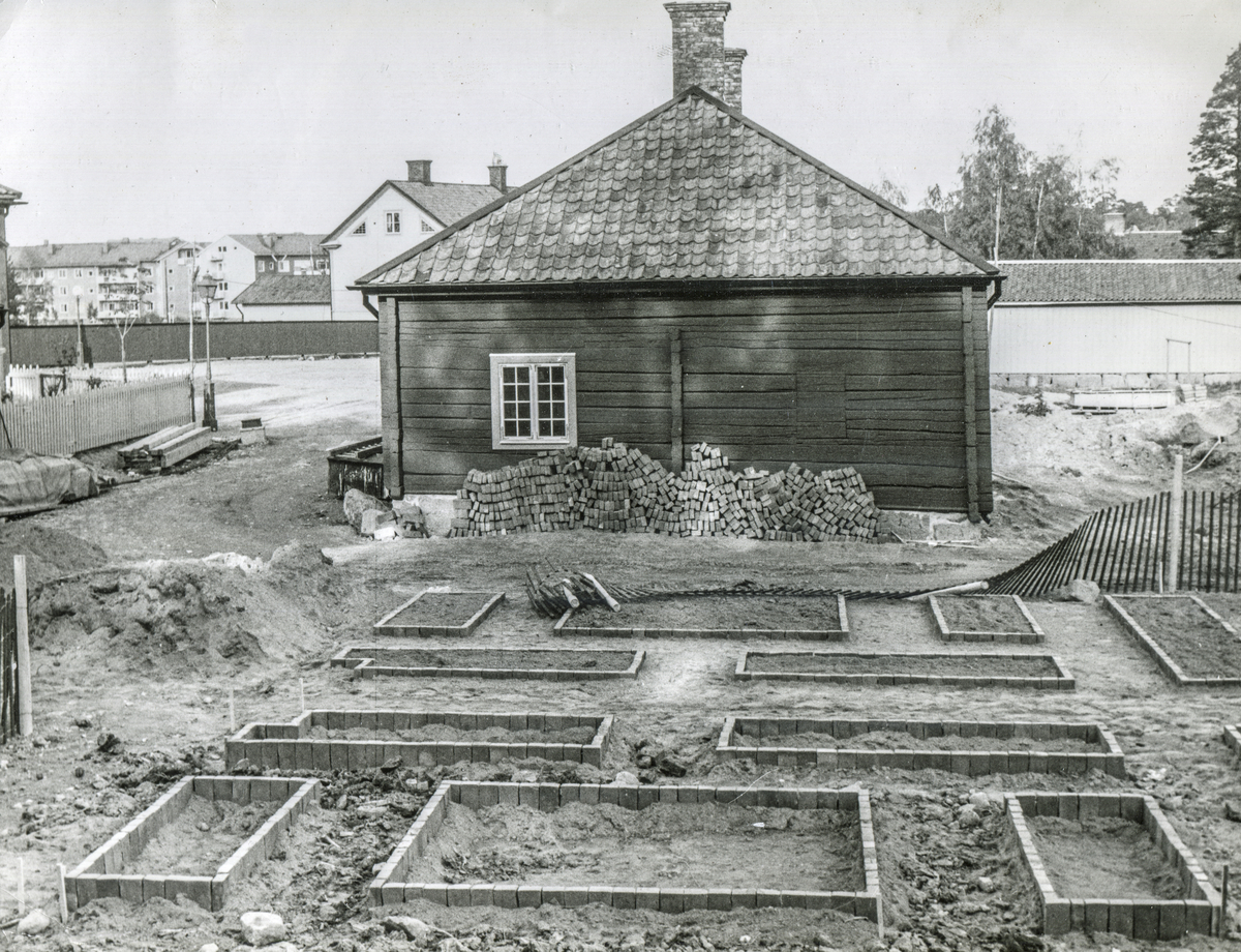 Arbete med örtagården i Gamla Linköping hösten 1956. I bakgrunden syns Skolmästaregården och bortanför den skymtar Rulanderska gården.