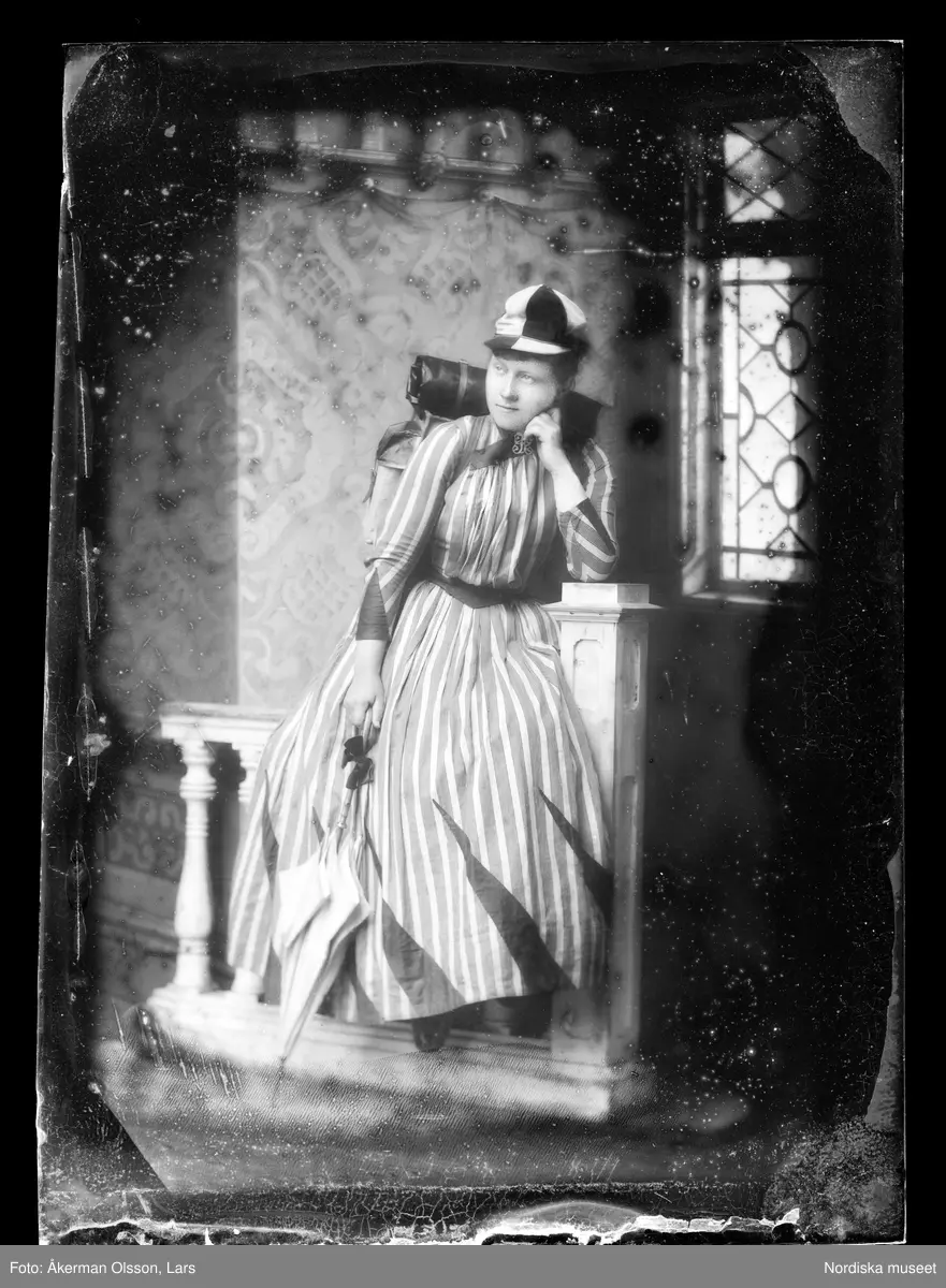 Helporträtt i atljé av en kvinna iklädd keps. Hon bär ryggsäck och ett parasoll i handen.