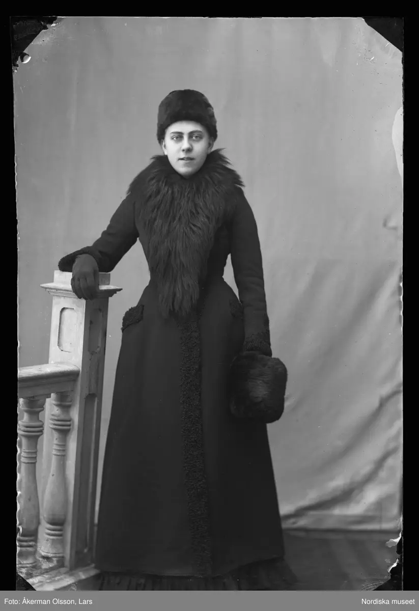 Porträtt av en kvinna iklädd kappa och hatt/mössa.