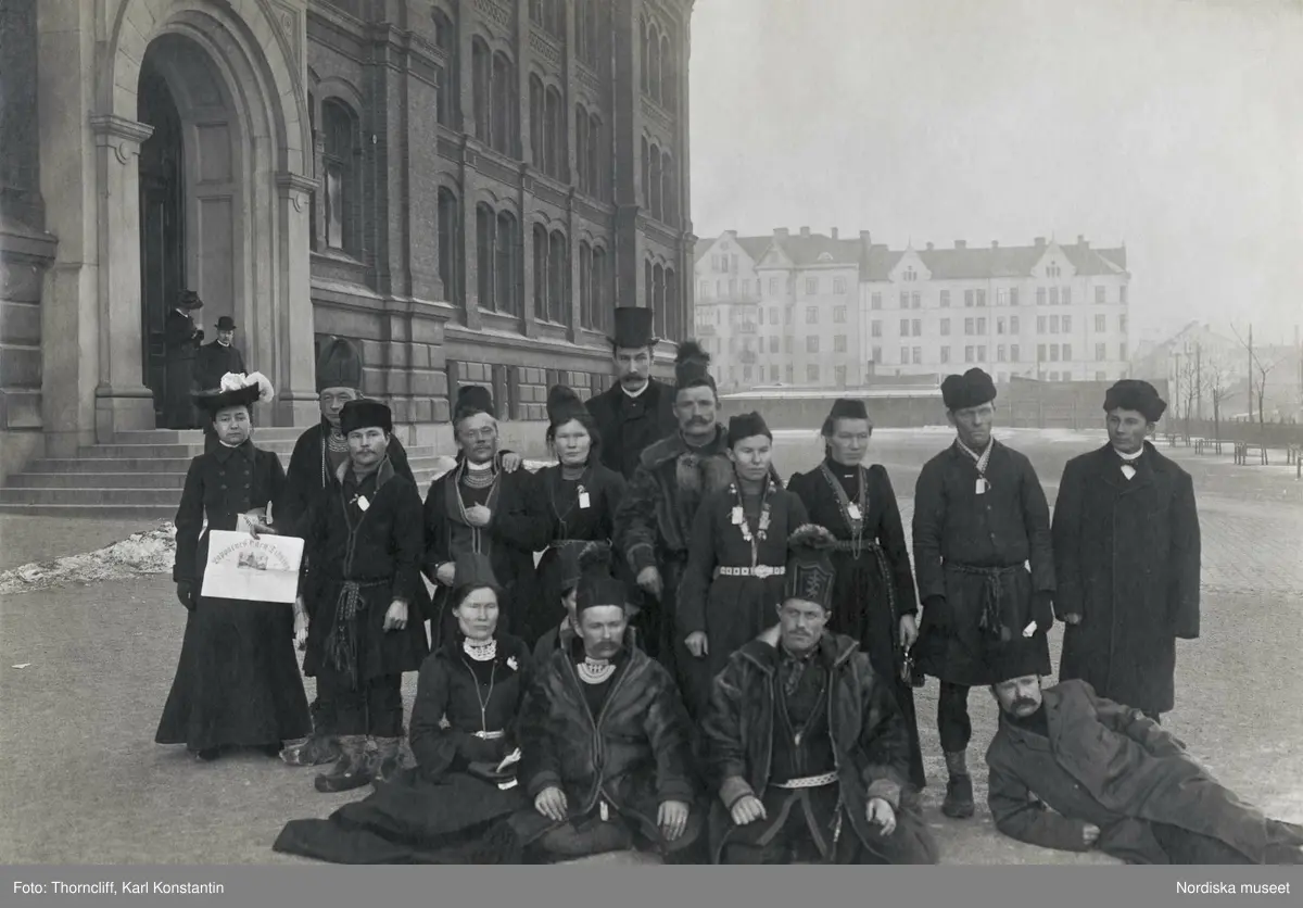 En grupp samer på besök i Stockholm bland annat för att delta på en populärvetenskaplig vinterkurs som Centralförbundet för nykterhetsundervisning anordnade den 2-8 januari 1905. En av männen håller upp en tidning: "Lapparnes Egen Tidning". En av medlemmarna i gruppen är Elsa Laula, sittande kvinna längst t.v. Bilden är tagen framför skolan Norra Real. Med på bilden är också Gustav Park (stående längst till höger) och Karin Stenberg (stående fjärde från höger). Jämför NMA.0048729.