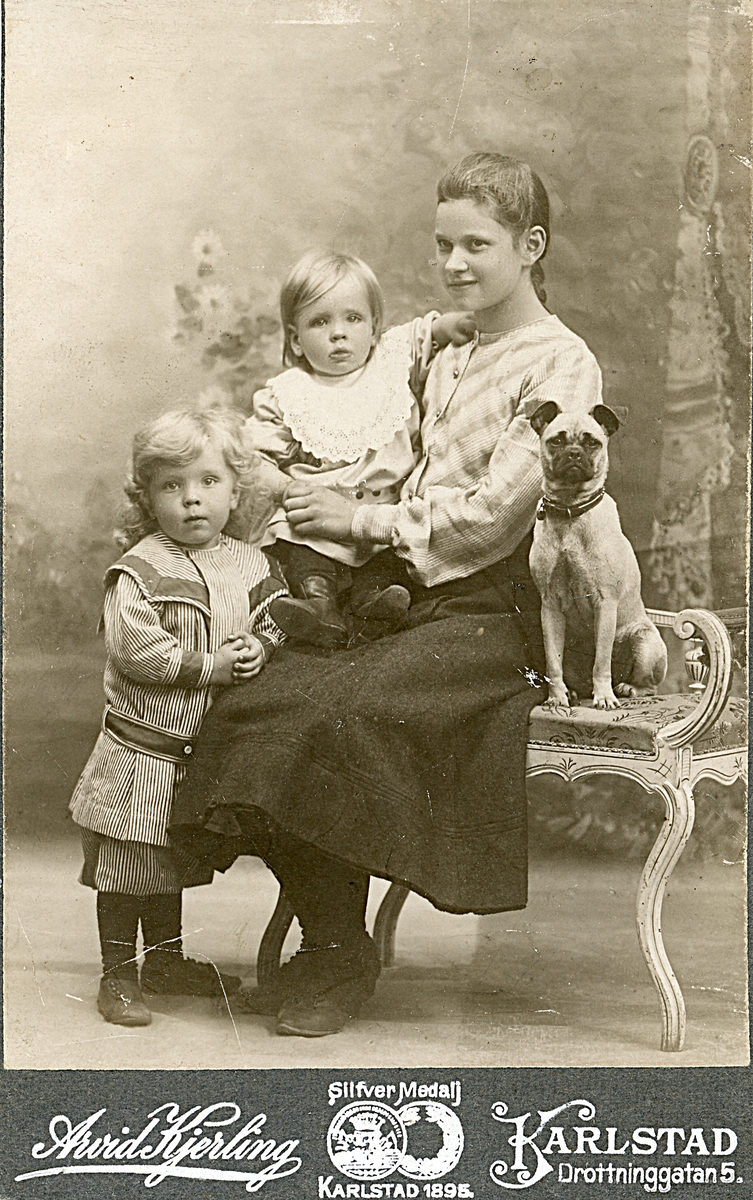 Porträtt av en ung kvinna, två barn och en hund.