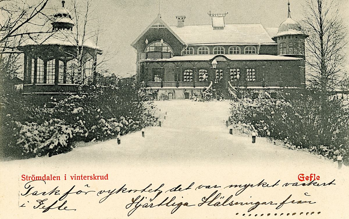 Brevkort över Strömdalen i vinterskrud med Strömdalens värdshus, Gefle.