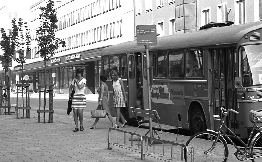 Bussen har stannat vid en hållplats på Stora gatan och släpper av passagerare. Västerås.