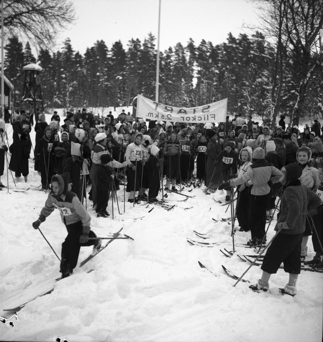 Titel: Skolungdomens fettistastävlingar på skidor. 1942