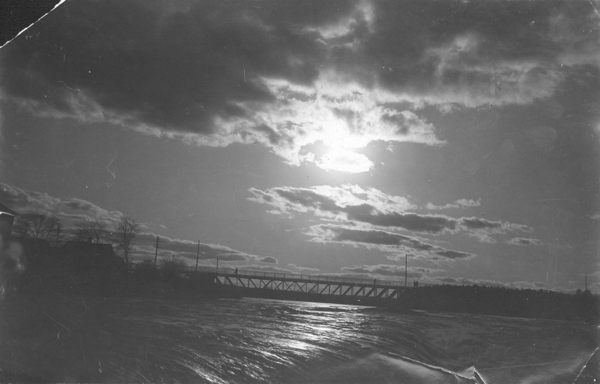 Bro över vattendrag. Siluetter av personer på bron. Motljus med molnig himmel och solreflex i vattnet.