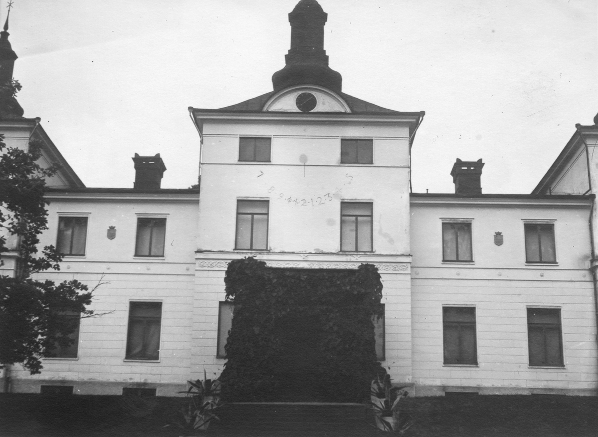 Svartvitt fotografi fångad exteriör av en större putsad byggnad i två våningar med centralt upphöjd mittdel och rundfönster. Murgrönska täcker entrépartiet. Tidigt 1900-tal.