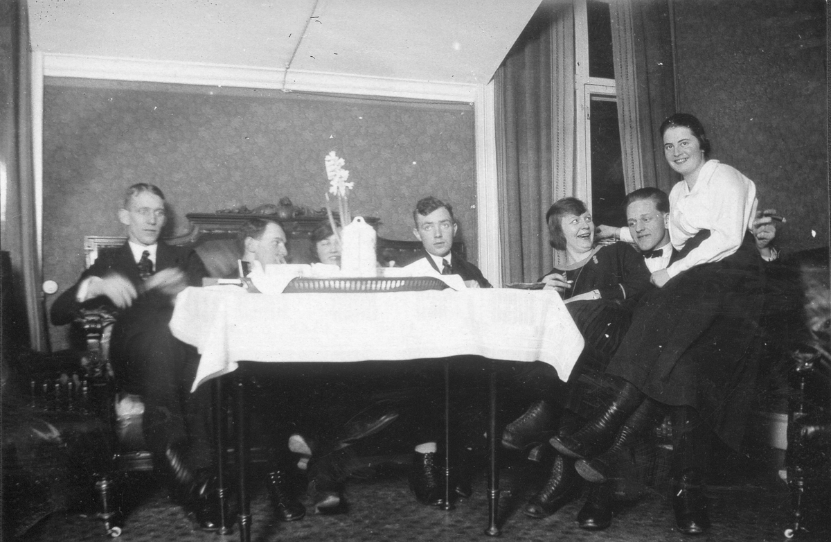 En grupp människor sitter samlade runt ett bord i en interiör. Personerna är klädda i tidstypiska kläder, 1910-1920 tal, och sitter tätt tillsammans i soffor och stolar. I bakgrunden syns tapetserade väggar, gardiner och ett fönster.
