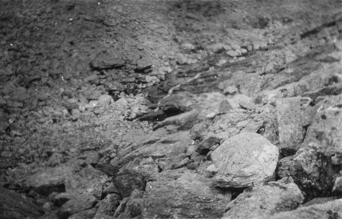 Foto av stenigt landskap med större klippblock och lös sten i en sluttning eller ravin.
