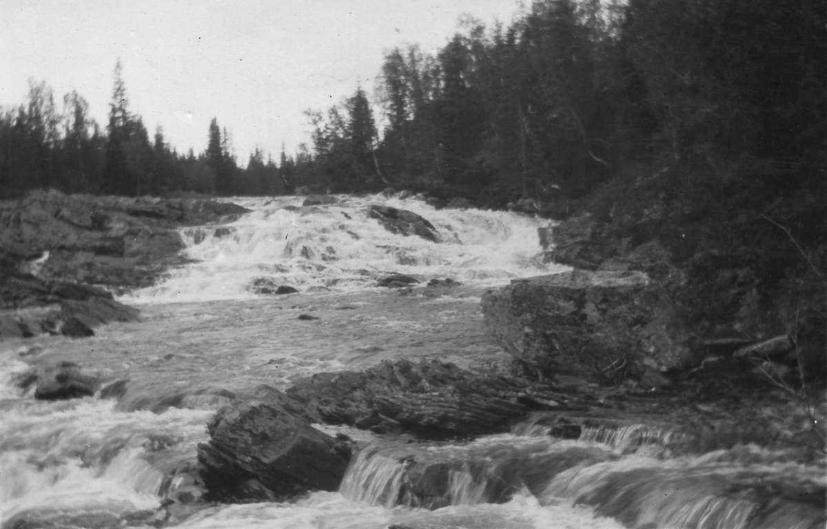 Forsande vattendrag med lågt vattenfall omgivet av stenblock och barrskog.