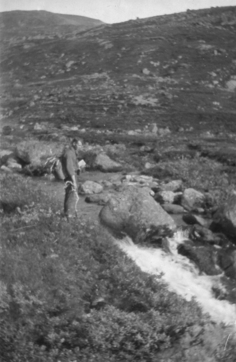 Person gående i fjällandskap längs ett vattendrag. Personen håller en pinne eller gren som käpp.