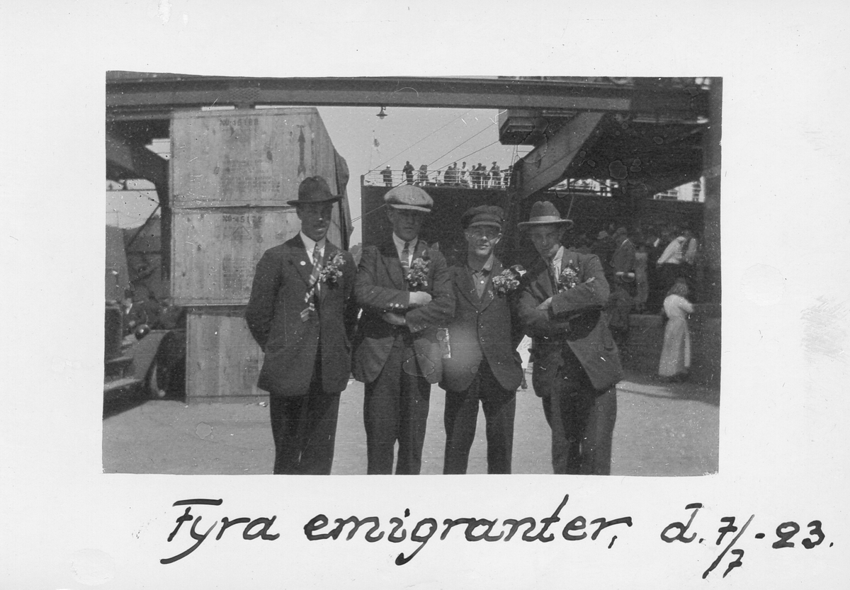 Fyra män står tillsammans på en kaj eller vid en hamn. På bilden finns anteckningen "Fyra emigranter 7/7 1923".