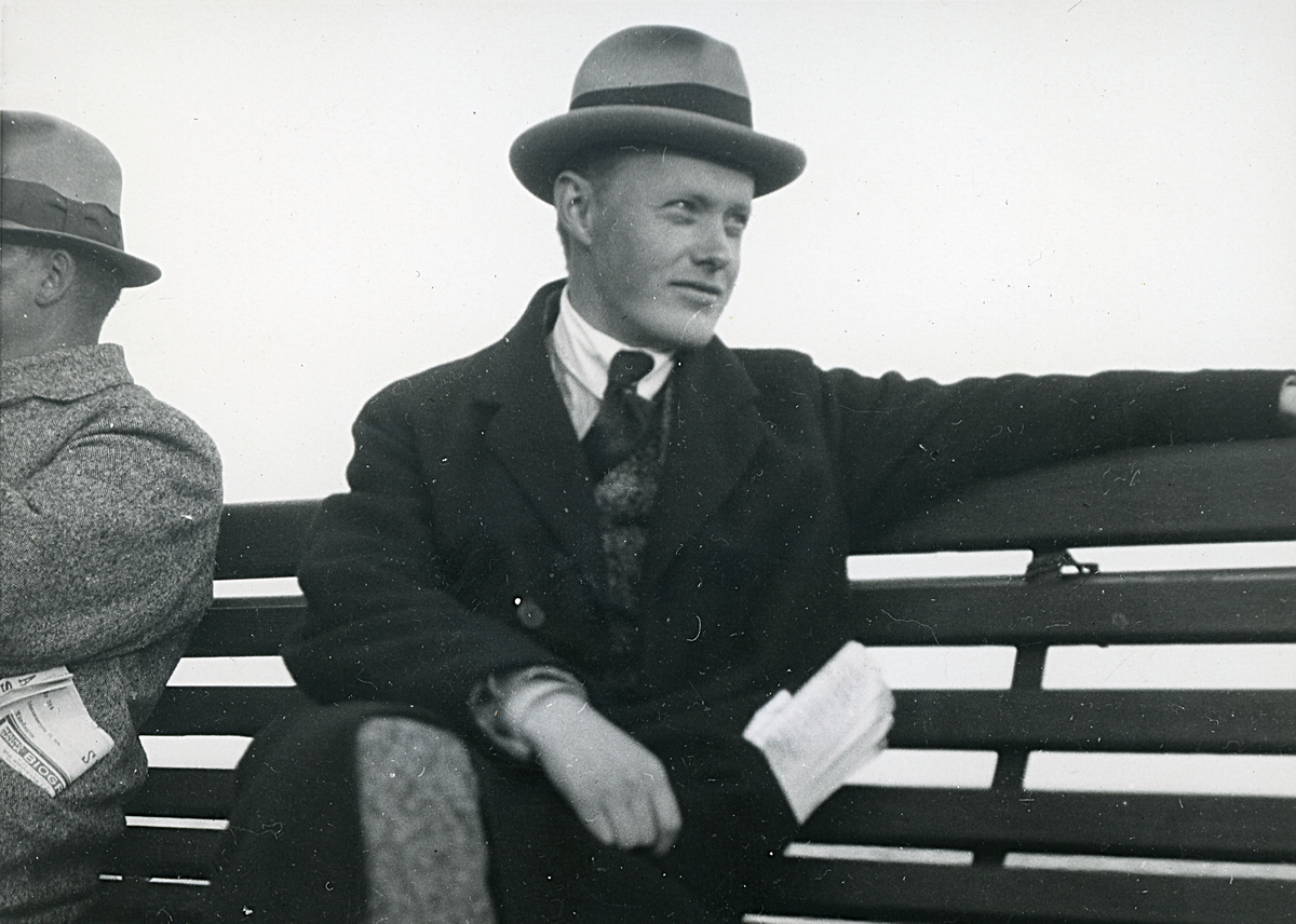 Tandläkare Gunnar Högberg sittande på en bänk i Hornbaek, Danmark 1920.