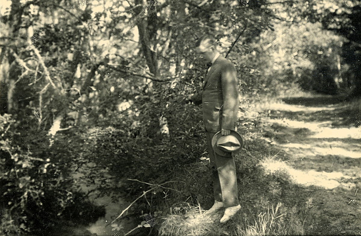 Tandläkare Gunnar Högberg står och blickar ner på en liten bäck någonstans i Torekov, Skåne 1922.