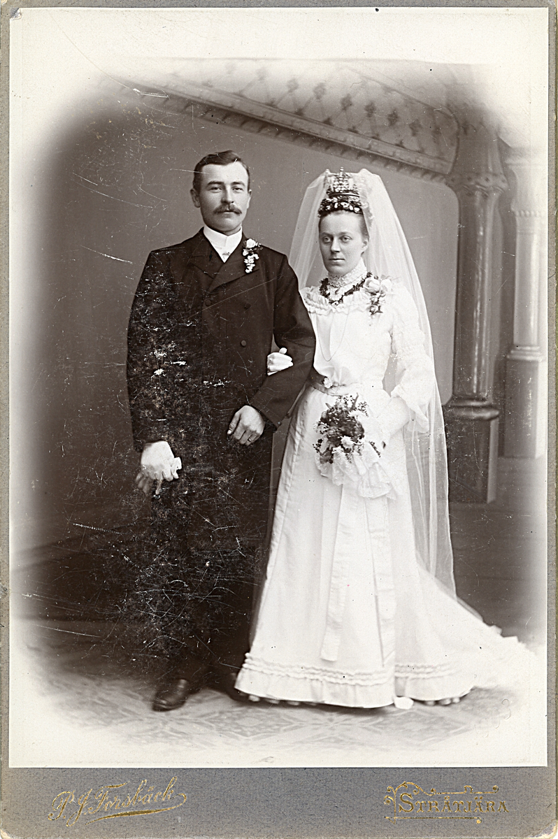 Titel: Bröllopsporträtt av brudparet Leonard Schönning, Elgnäs-Lingbo (enligt text i album).