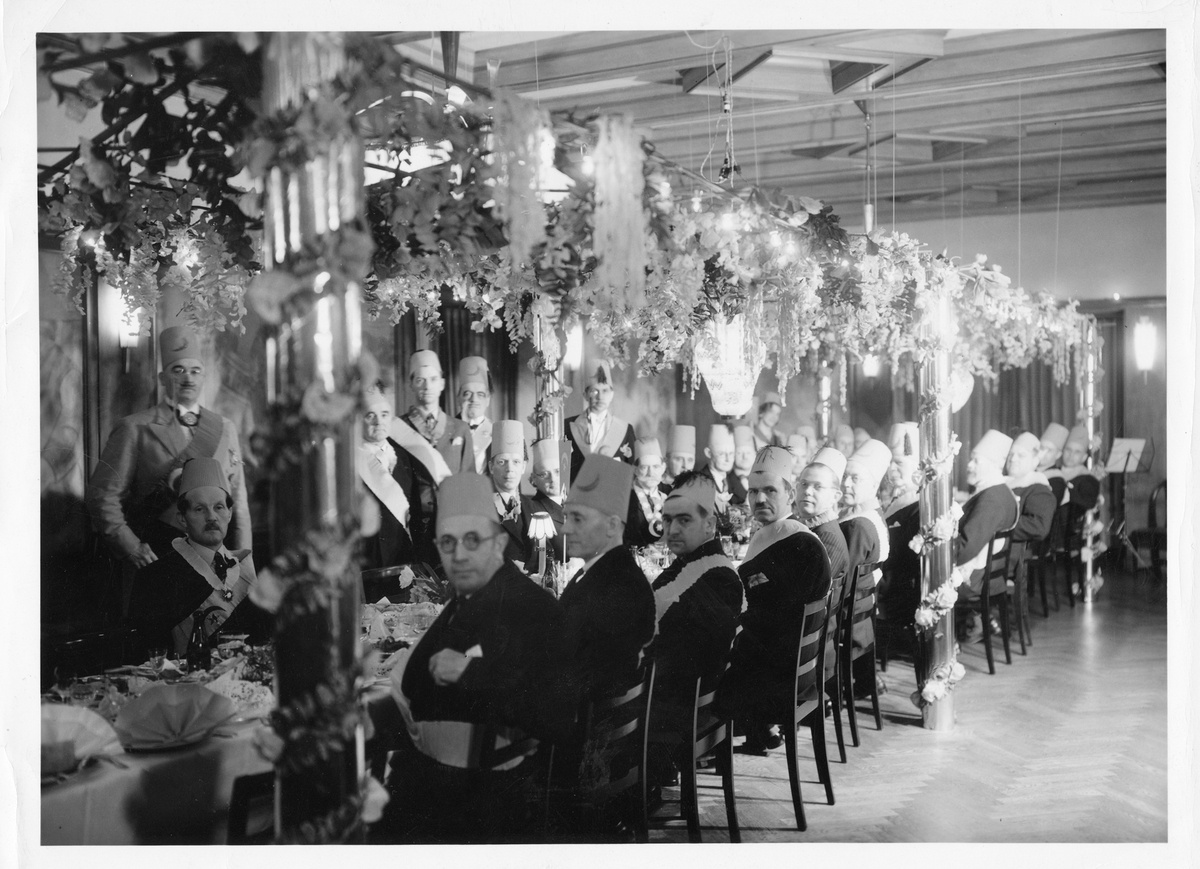 Festbjudning, herrar runt ett dukat bord.