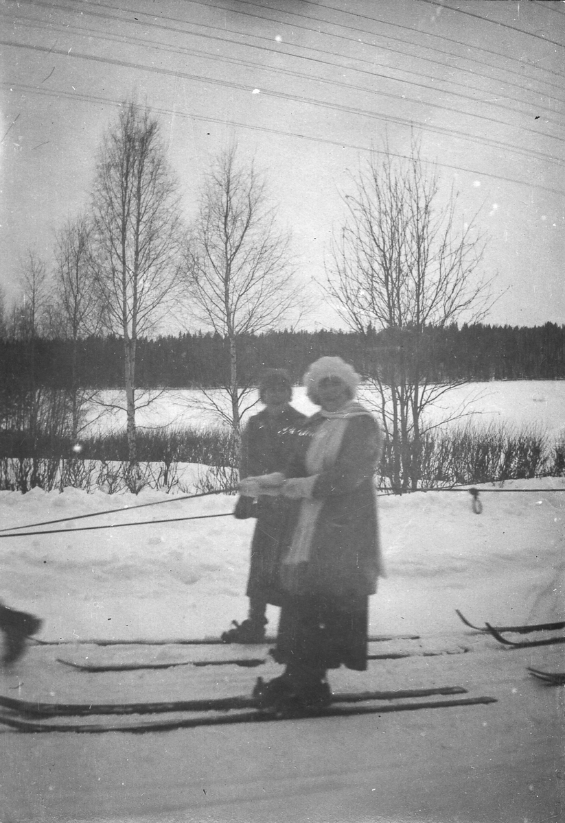 Två personer avbildade stående på skidor i snötäckt landskap. Vinterklädsel med kappor och huvudbonader förekommer. I bakgrunden ses lövträd, buskage och skogsbryn samt överliggande ledningar. Tidigt 1900-tal.