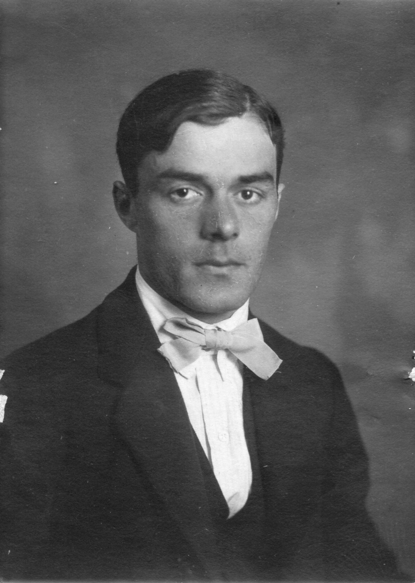 Ett porträtt av en ung man i mörk kostym med fluga och vit skjorta. Han är avbildad mot en neutral bakgrund och ser rakt mot kameran.