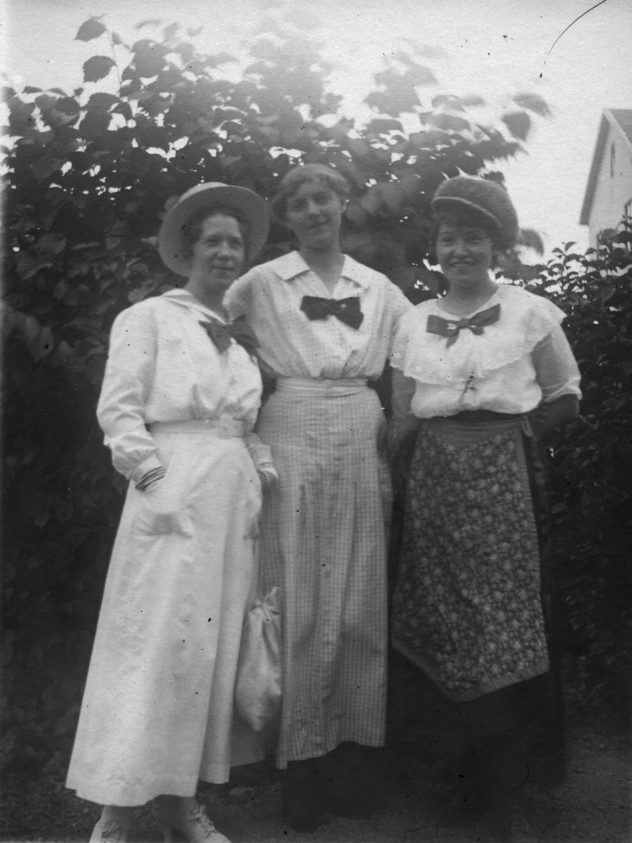 Tre kvinnor avbildade stående utomhus framför en lövklädd buske. Ljusa blusar med mörka rosetter vid kragen bärs av samtliga. Lång kjol respektive klänning samt olika huvudbonader förekommer. En byggnad skymtar i bakgrunden. Tidigt 1900-tal.