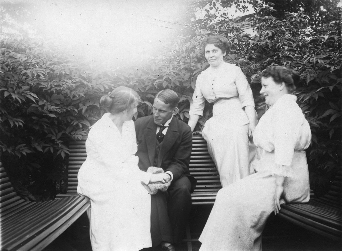 Svartvitt fotografi av fyra vuxna personer sittande på bänkar i en trädgård. En man i kostym sitter mellan två kvinnor, medan ytterligare en kvinna står bakom. Personerna tycks samtala. Tät vegetation bildar bakgrund.