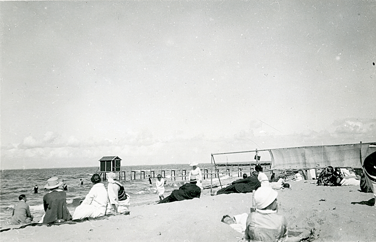 Människor som badar i havet samt sitter på stranden, en badhytt syns längst ut på bryggan i Hornbaek, Danmark 1920.