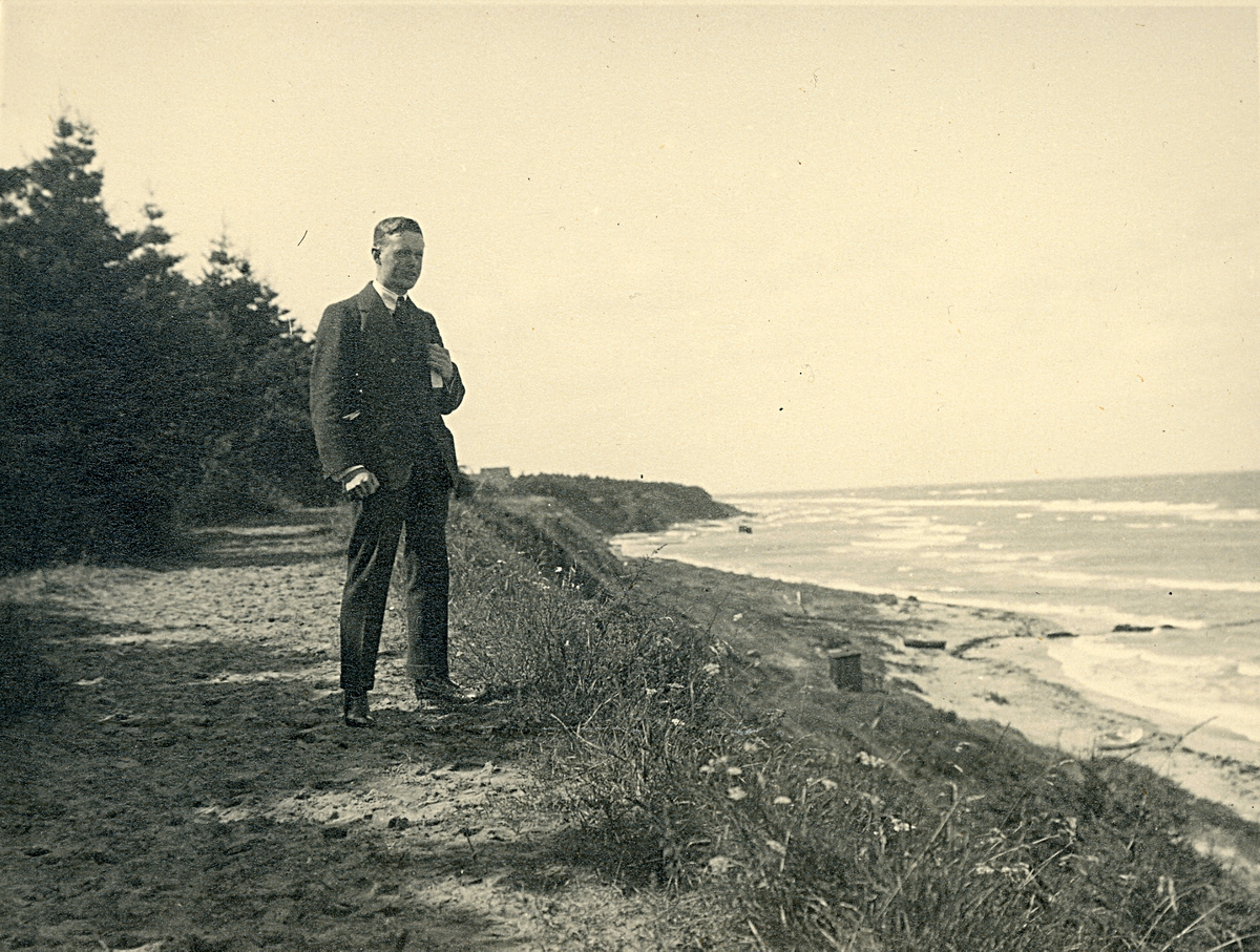 Tandläkare Gunnar Högberg stående på en strand i Huleröd, Danmark 1920.