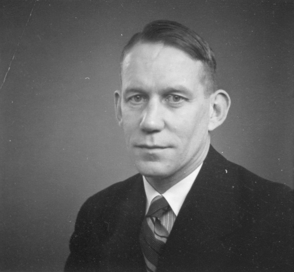 Svartvitt ateljéporträtt av en vuxen man i halvfigur mot neutral bakgrund. Han bär mörk kostym, vit skjorta och randig slips. Håret är kort och kammat med sidbena. Mannen har ett neutralt ansiktsuttryck och ser rakt mot kameran. Fotografiet är taget i studio under 1910-1920 tal.