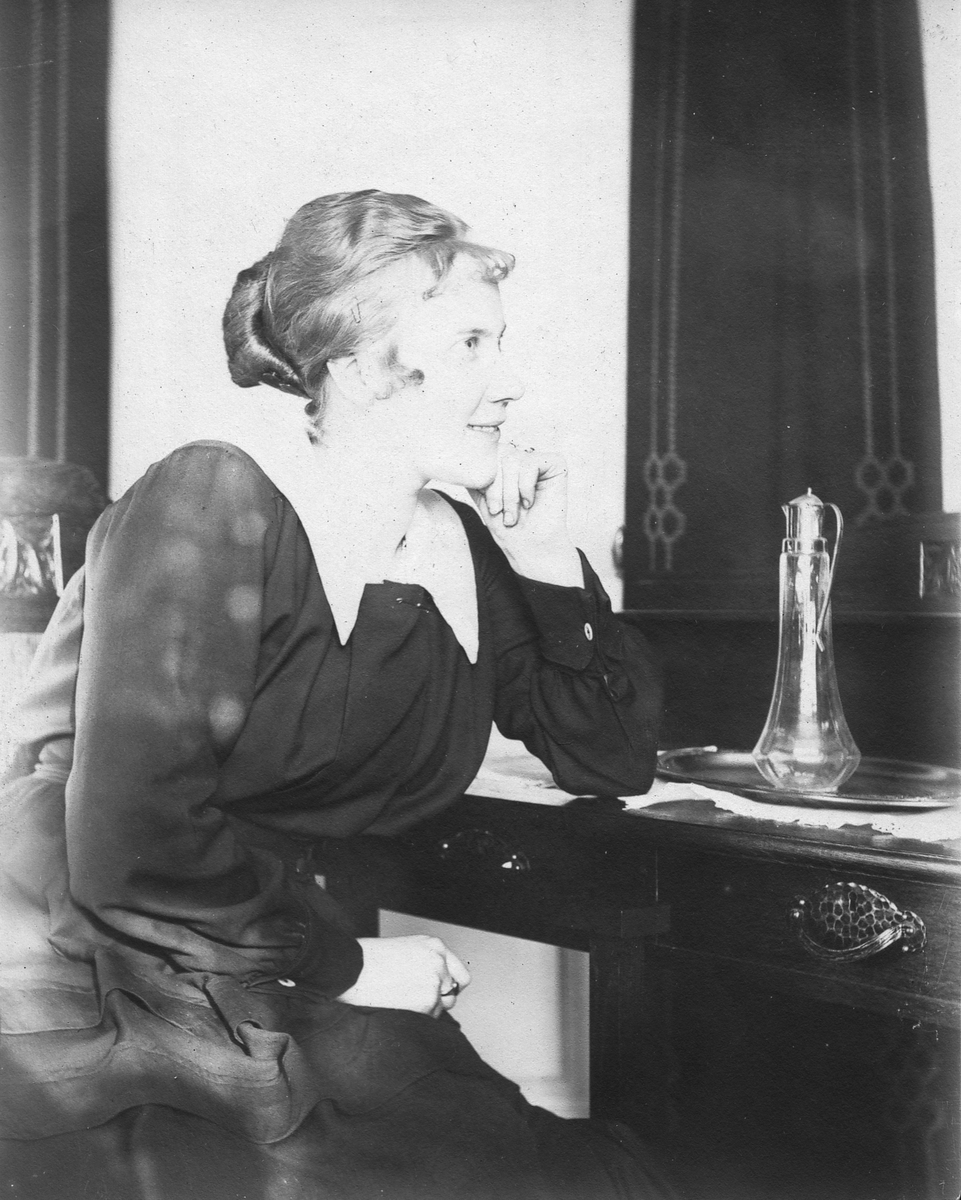 En kvinna sitter vid ett bord i en interiör och lutar hakan mot handen. På bordet står en karaff på en bricka. Mörka möbler och väggparti i bakgrunden.