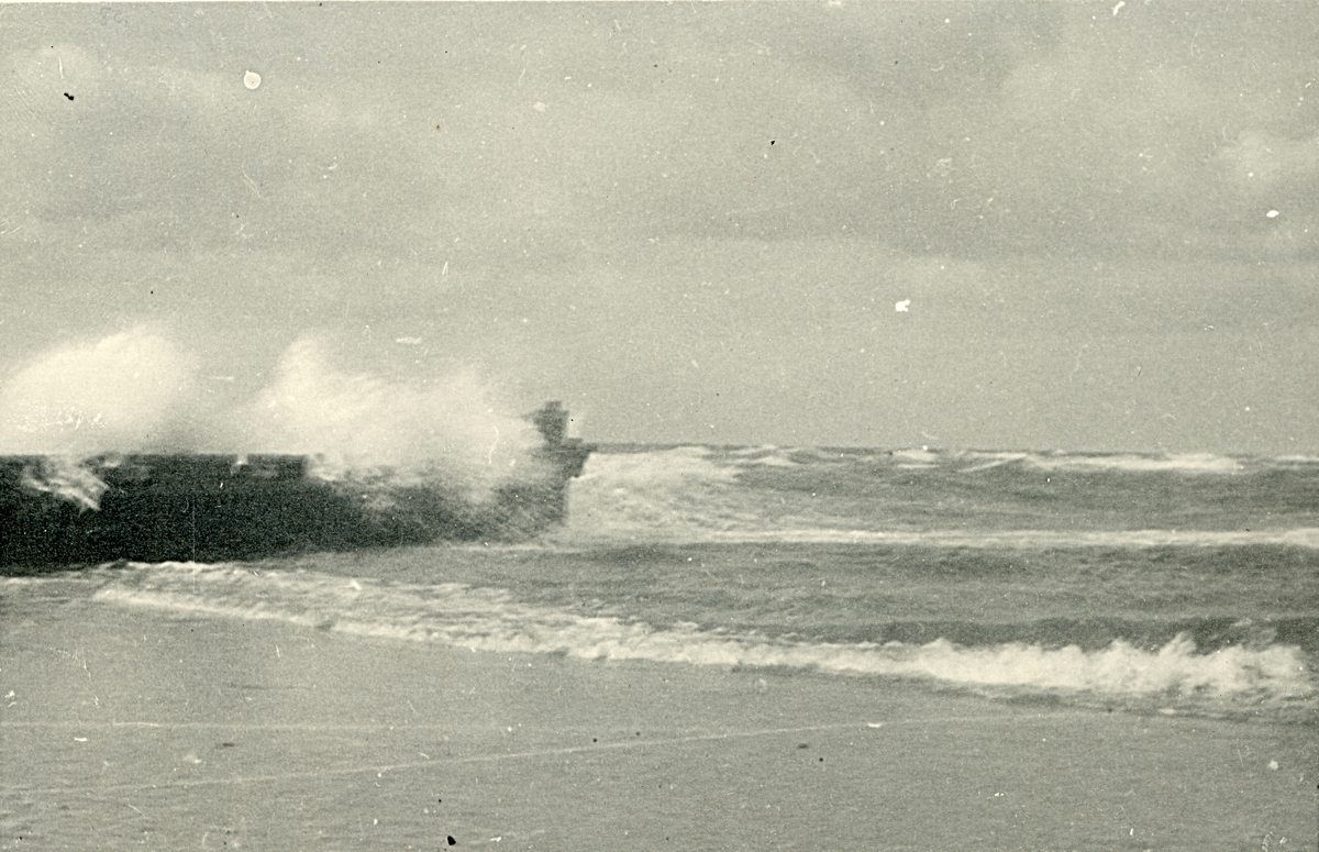 Vågor som bryts mot en pir vid Liseleje strand, Danmark 1925.