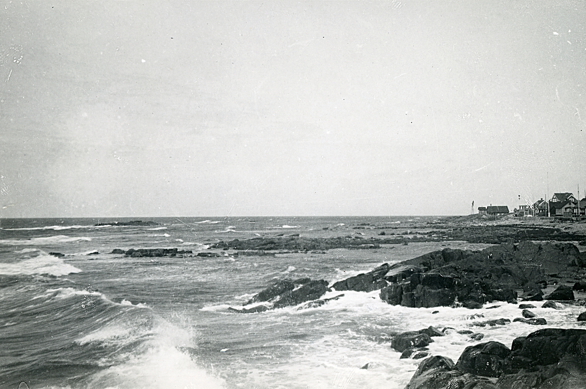 Vy över hav, bebyggelse och klippor vid Torekov, Skåne 1922