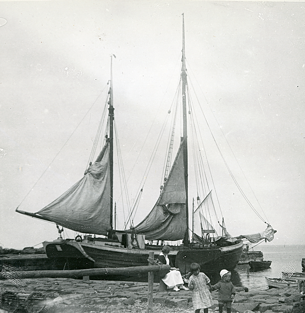 En galeas som ligger förtöjd i en hamn där en kvinna och två barn syns i förgrunden. Torekov, Skåne 1922.