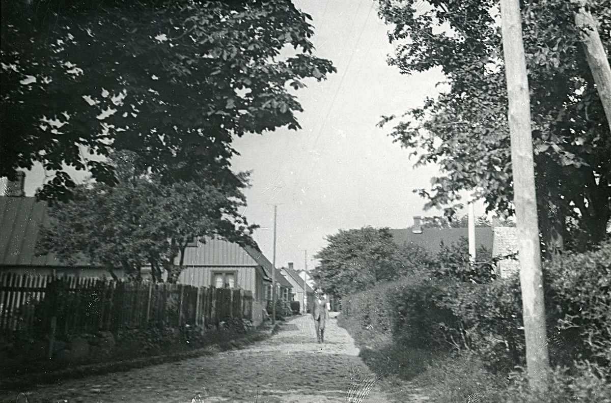 Vy över en idyllisk gata med trähus, staket och lummig grönska i Torekov, Skåne 1922.