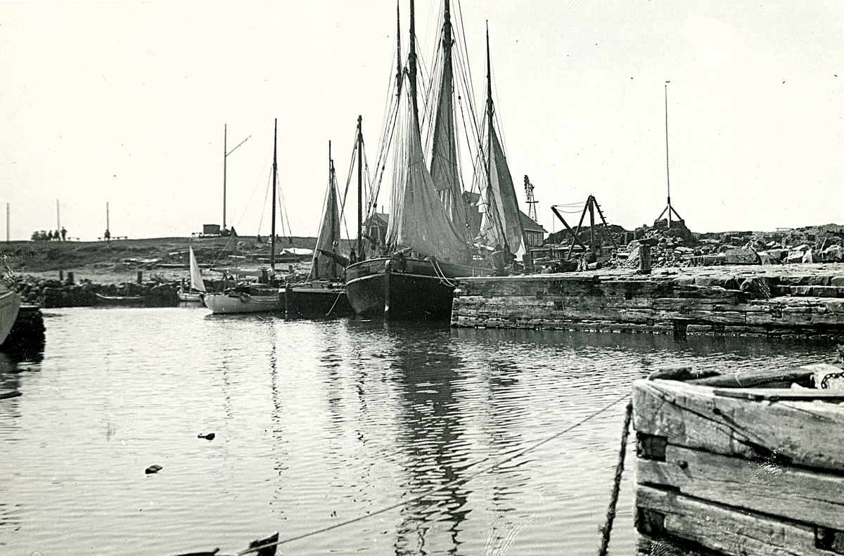 Vy över en hamn med segel- och fiskebåtar ligger förtöjda vid kajen vid Torekov, Skåne 1922.