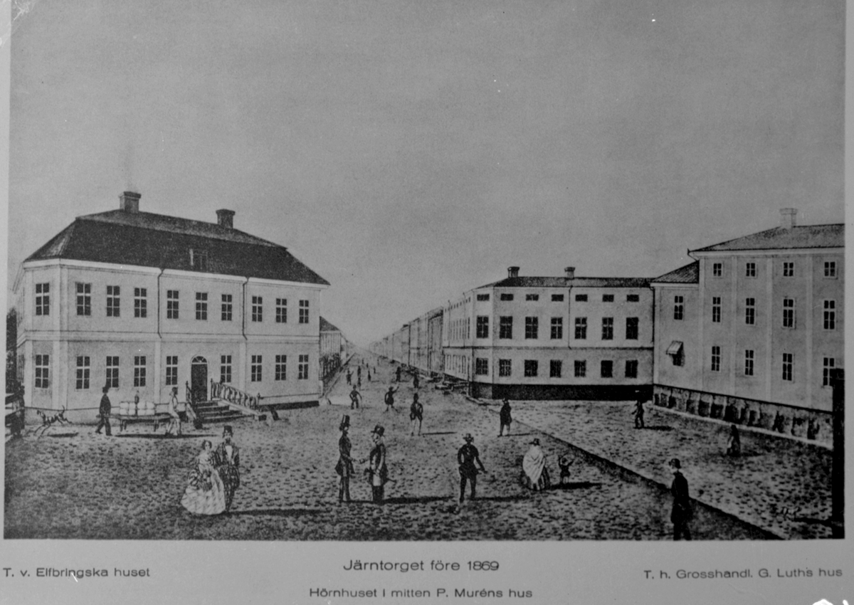 "Till vänster Elfbringska huset. Hörnhuset i mittten P. Muréns hus. Till höger G. Luths hus. Järntorget före 1869".