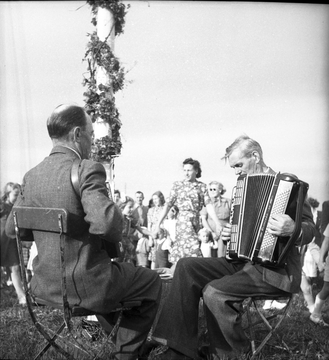 Midsommarstångsresning med dans i kolonin och stadsträdgården.
