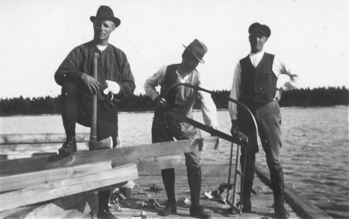 Tre män på en brygga som arbetar med sågverktyg.