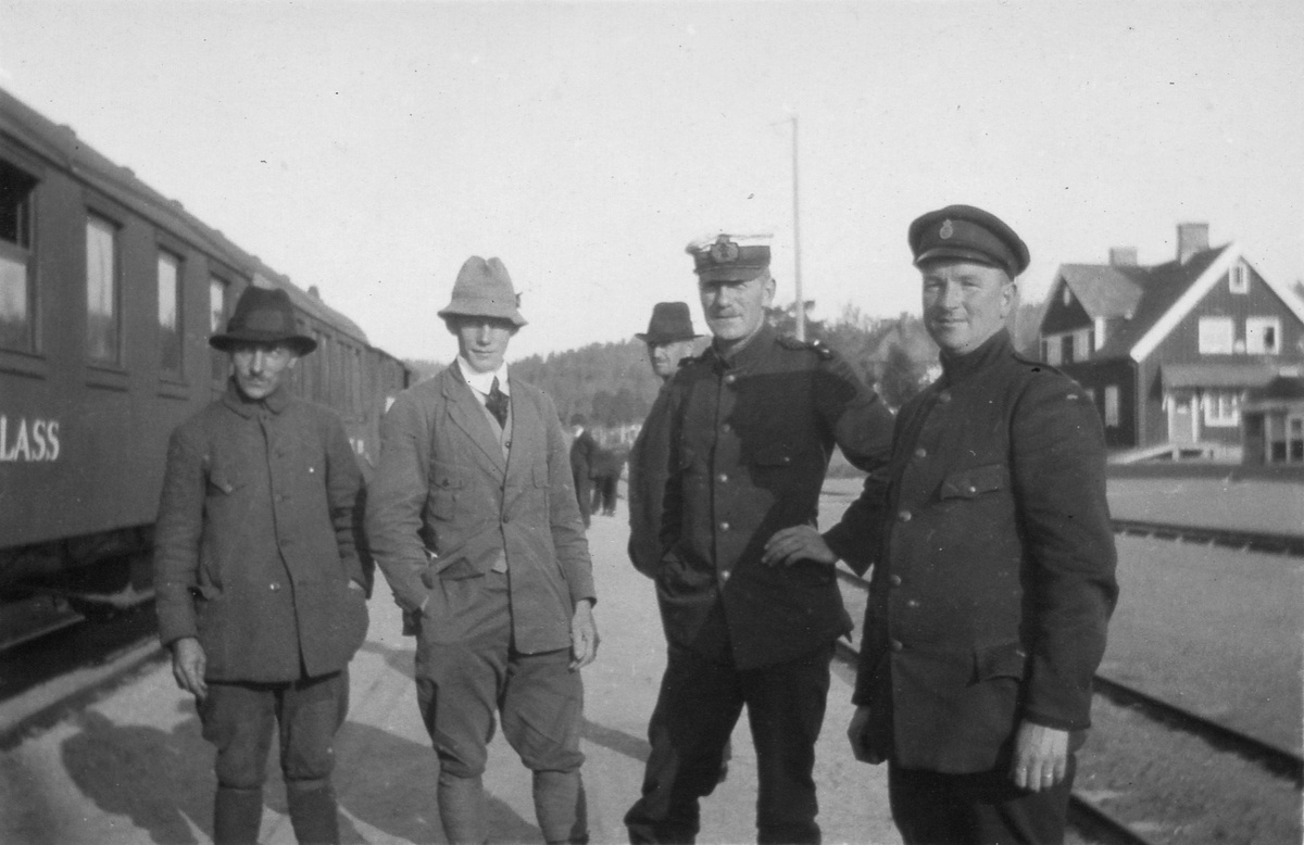 Fyra män stående vid järnvägsspår intill ett tåg. Bebyggelse syns i bakgrunden.